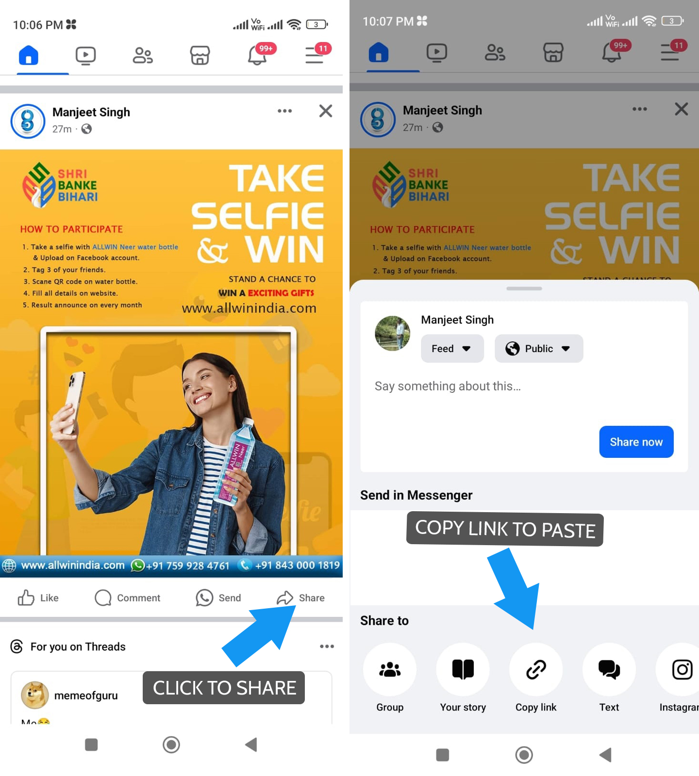 Take a selfie with ALLWIN Neer water bottle & Upload on Facebook account & " Tag 3 of your friends ".